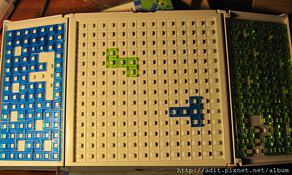 最後比剩下多少棋子,每個棋子上的格數不同,最後留下比較少格數的玩家獲勝。